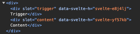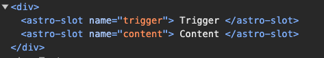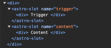 <!-- Astro --><Popover client:load> <div slot="trigger"> ... </div> <div slot="content"> ... </div></Popover><!-- Svelte --><Popover> <div slot="trigger"> ... </div> <div slot="content"> ... </div></Popover>Astro produces HTML that contains the contents within an <astro-slot> element, while Svelte produces HTML directly.