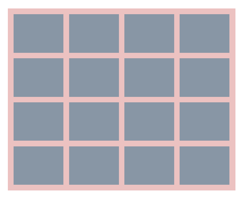 <div class="content"> <ul class="gallery"> <li class="gallery-item"></li> <li class="gallery-item"></li> <li class="gallery-item"></li> <li class="gallery-item"></li> <li class="gallery-item"></li> <li class="gallery-item"></li> <li class="gallery-item"></li> <li class="gallery-item"></li> </ul></div>We can use the gallery() mixin to quickly create the gallery. Since there are four items on each row, and the context is 8 columns, we know that each gallery item will take up 2 columns.