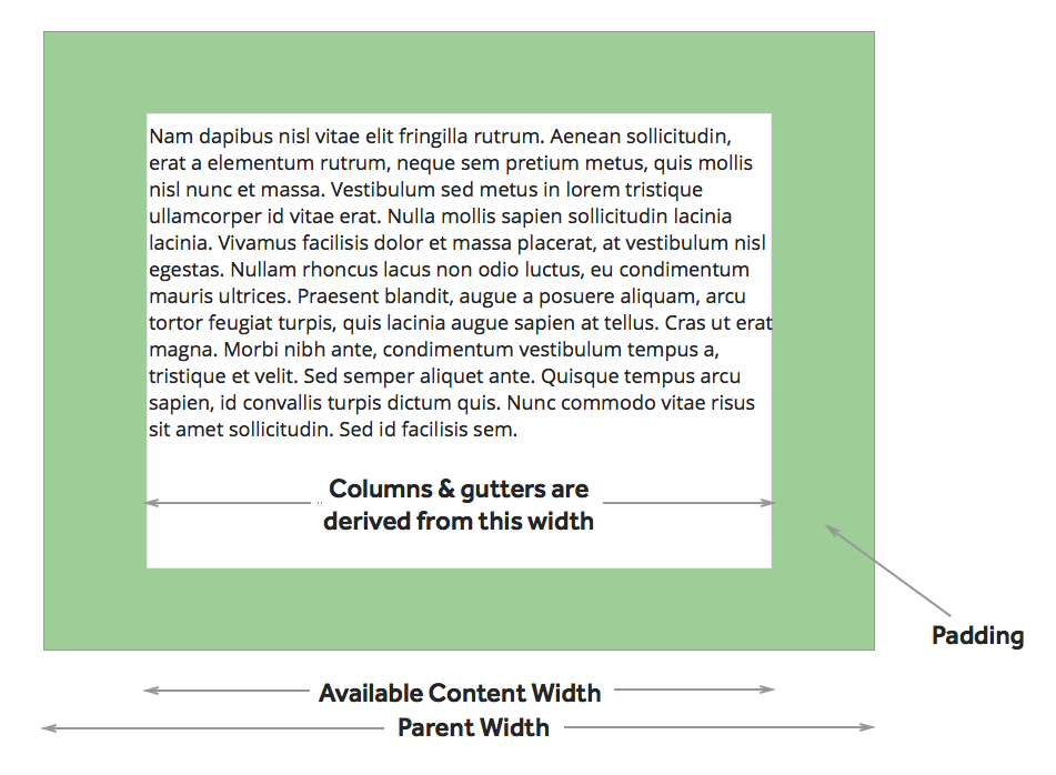 When we add padding to the parent container (assuming you are on border-box sizing), we push the content within inwards. The column and gutter sizes will not be exactly the same as the ones we used in the outer content. Most of the time though, this effect is negligible at about a 1px difference.