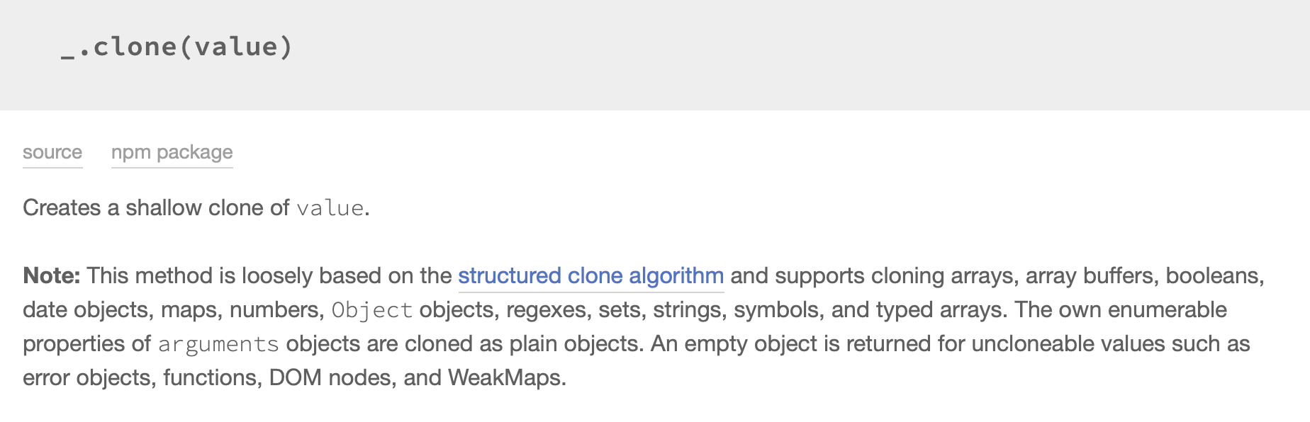 In its documentations, Lodash explained _.cloneDeep (which recursively uses _.clone) was loosely based on the Structured Clone Algorithm. I was intrigued and dove into the source code.