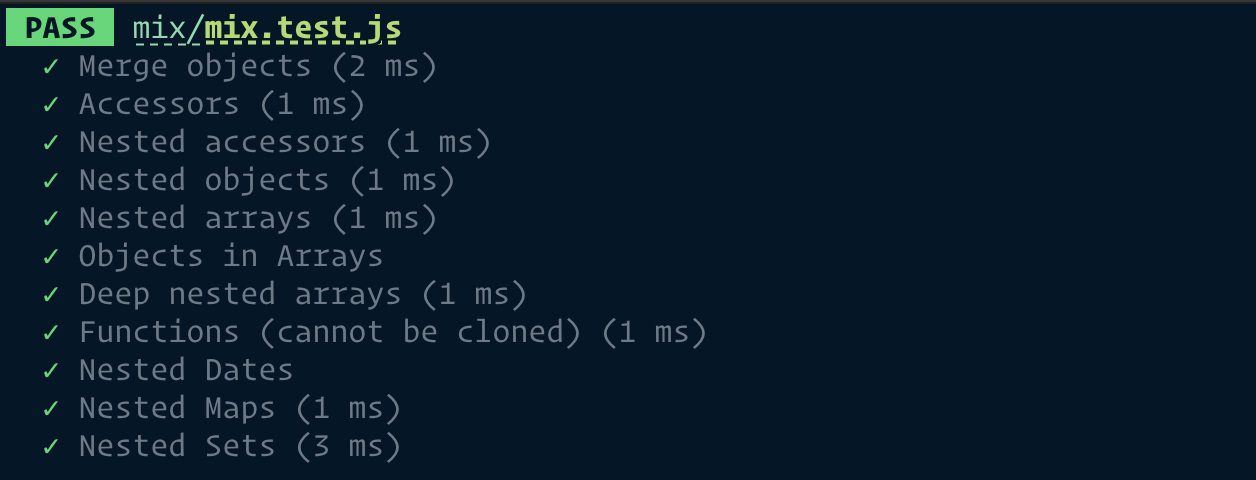 // First version, shallow merge.function mix(...sources) { const result = {} for (const source of sources) { const props = Object.keys(source) for (const prop of props) { const descriptor = Object.getOwnPropertyDescriptor(source, prop) Object.defineProperty(result, prop, descriptor) } } return result}I explained the creation process for this simple mix function in my previous article, so I won’t say the same thing again today. Go read that one if you’re interested to find out more.