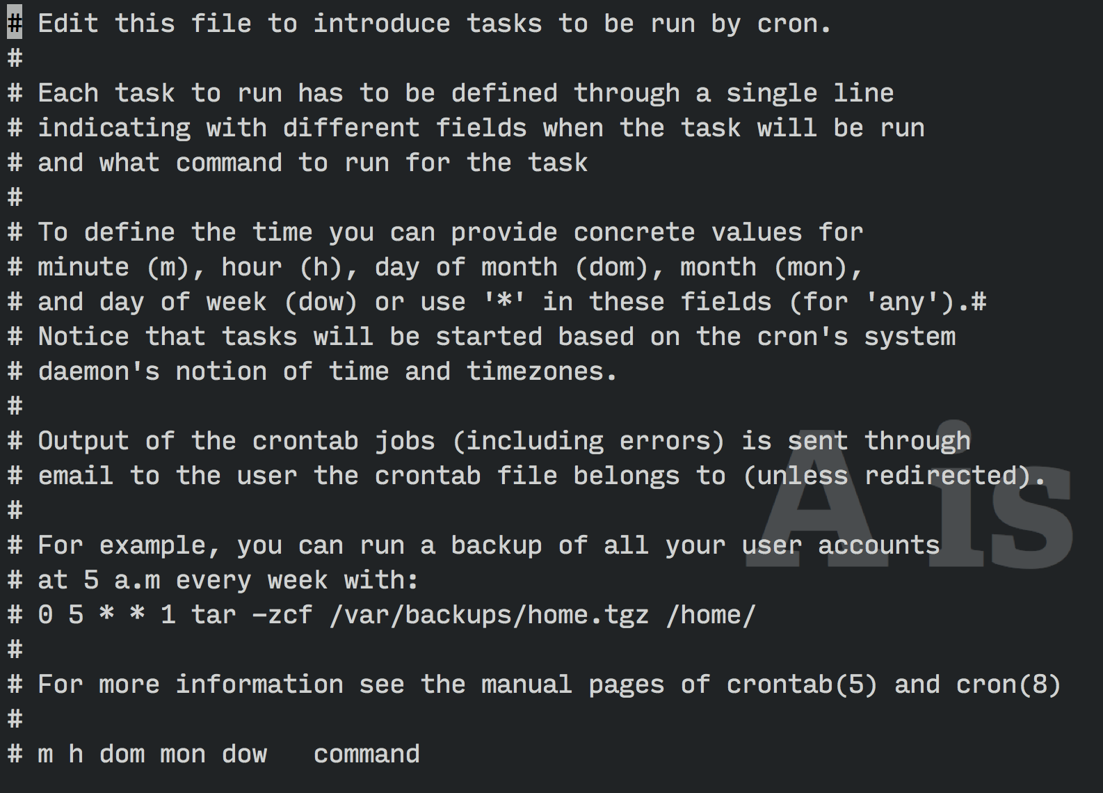 crontab -eThis command brings up a file that you can edit: