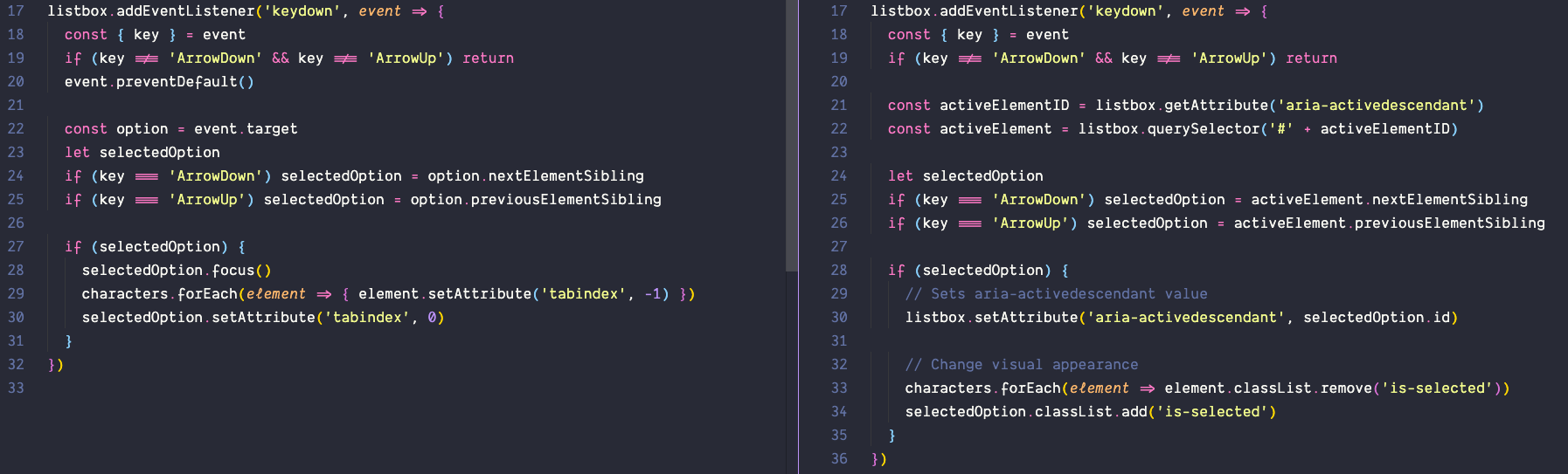listbox.addEventListener('keydown', event => { // ... const nextElement = activeElement.nextElementSibling if (nextElement) { // Sets aria-activedescendant value listbox.setAttribute('aria-activedescendant', selectedOption.id)