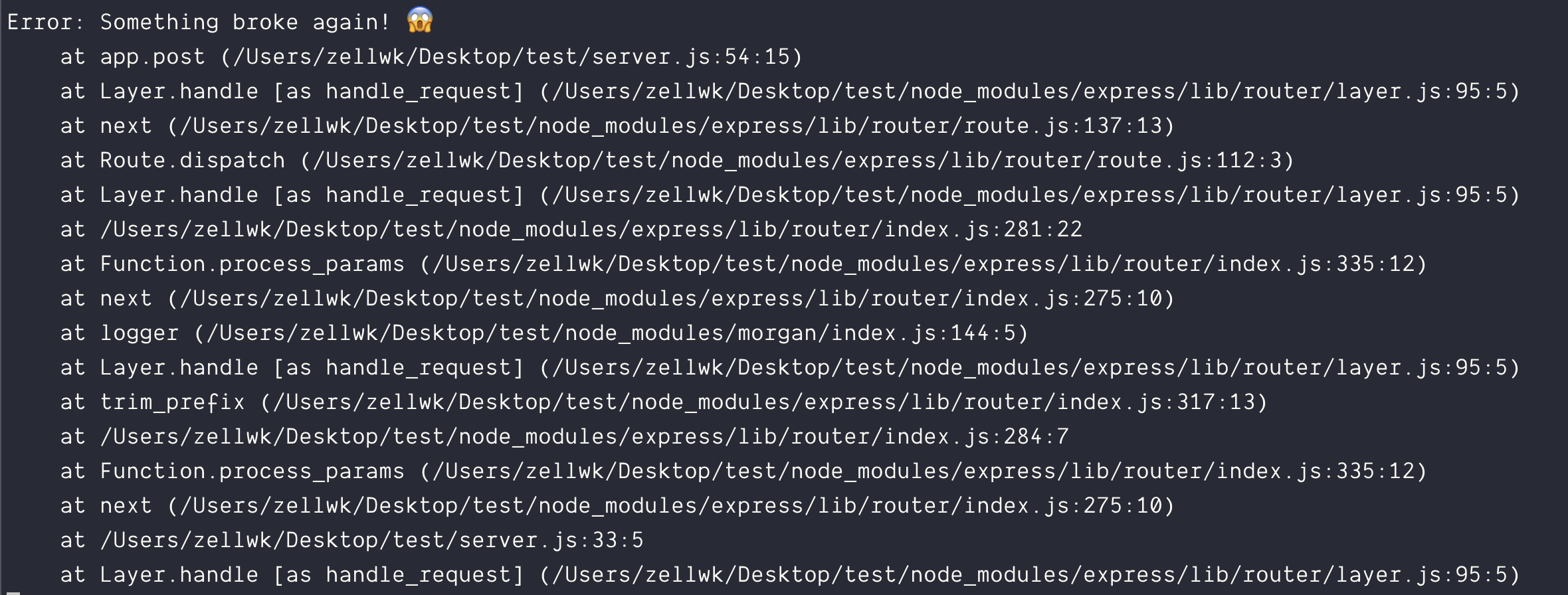 app.post('/testing', (req, res) => { throw new Error('Something broke! 😱')})These errors can be caught with an Express error handler. If you did not write a custom error handler (more on this below), Express will handle the error for you with a default error handler.