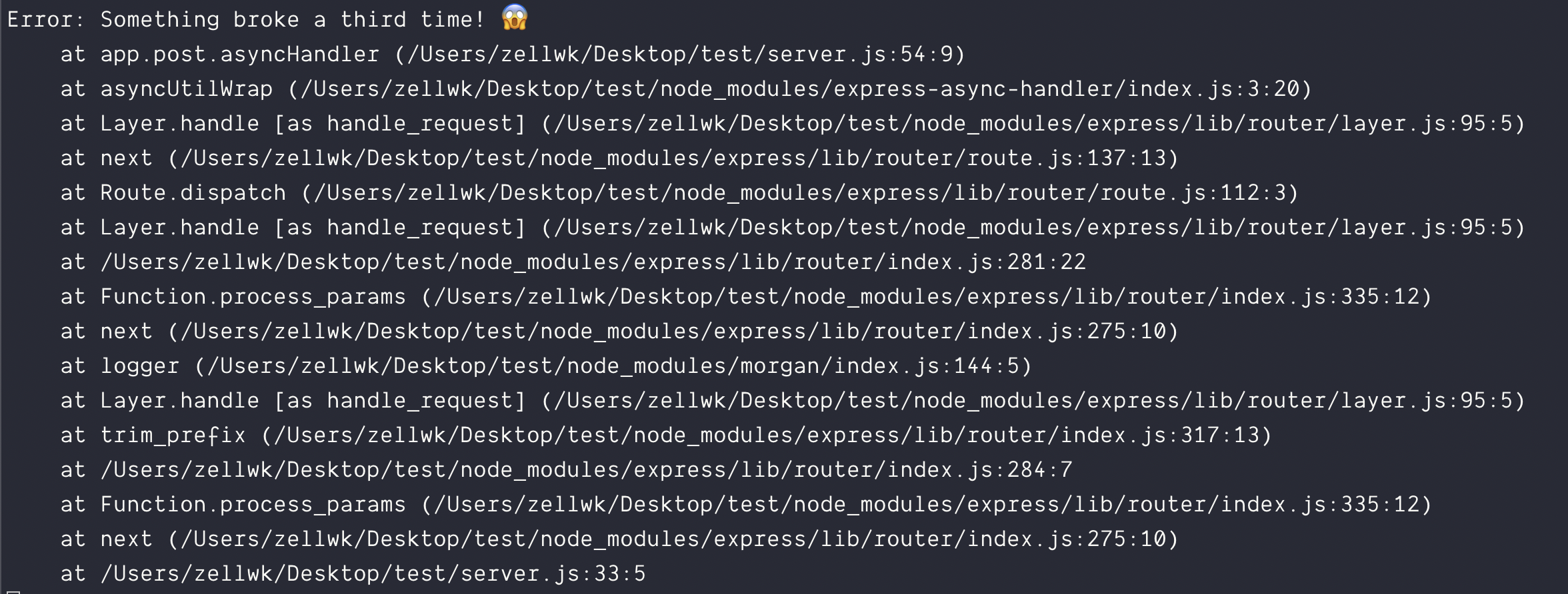 app.post( '/testing', asyncHandler(async (req, res, next) => { throw new Error('Something broke yet again! 😱') }))