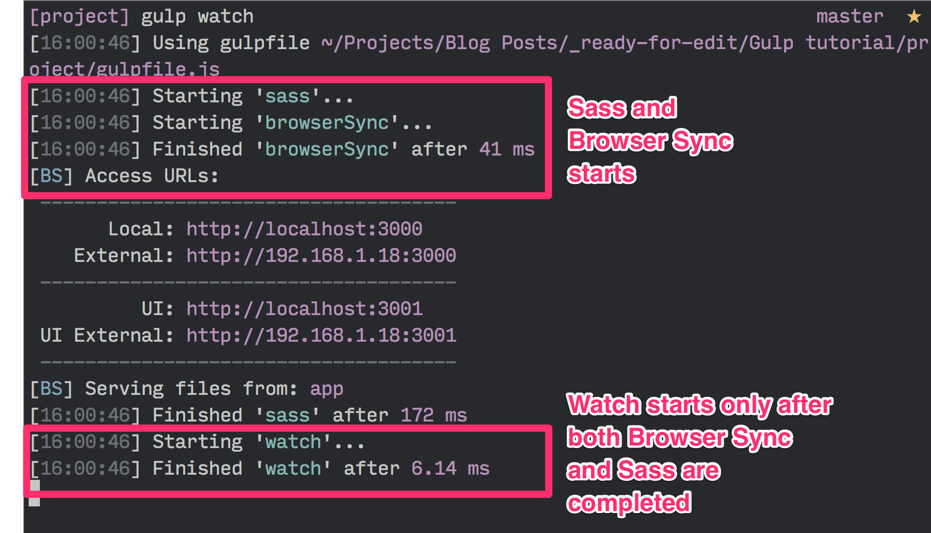 gulp.task('watch', ['sass'], function () { gulp.watch('app/scss/styles.scss', ['sass']) // ... Other watchers})Now if you run the watch task, you’ll see that Gulp tells the command line to first run the sass task, followed by the watch task.
