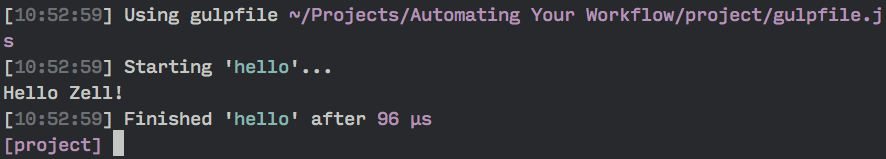 $ gulp helloYou should see a log from the terminal saying “Hello Zell!” once you ran the code in the terminal.