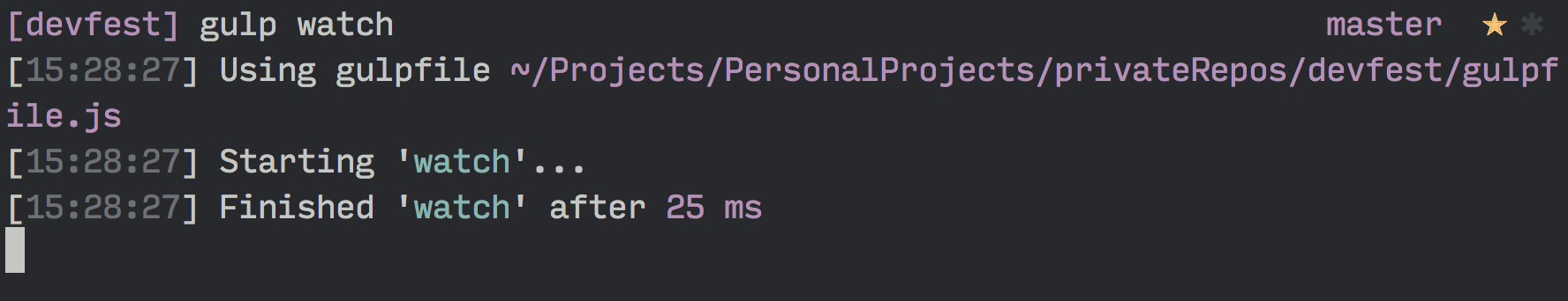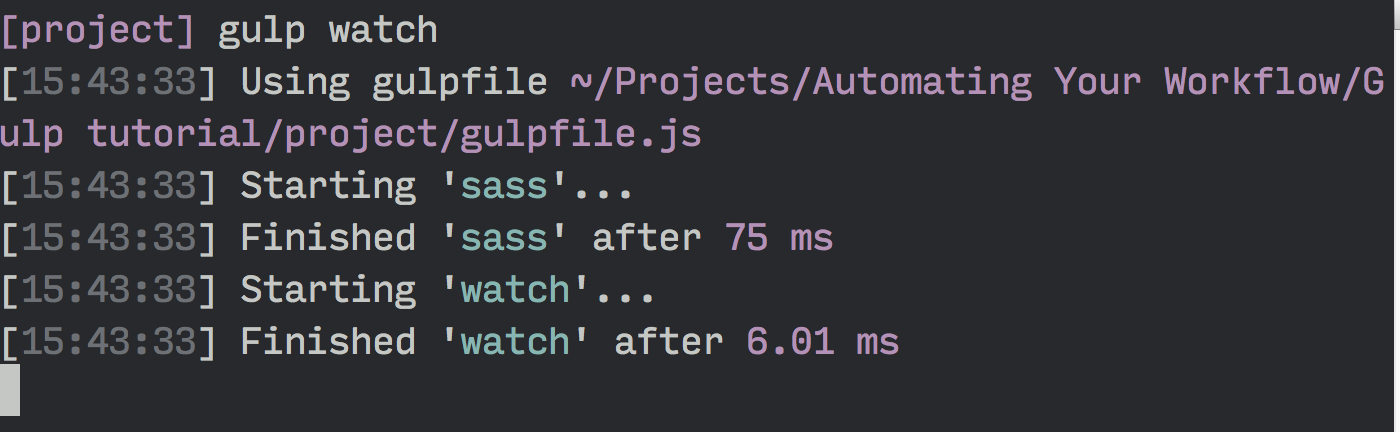 gulp.task('watch', function () { gulp.watch('app/scss/styles.scss', ['sass']) // ... Other watchers})Now if you run the watch command you’ll see that gulp immediately starts watching your files for changes.