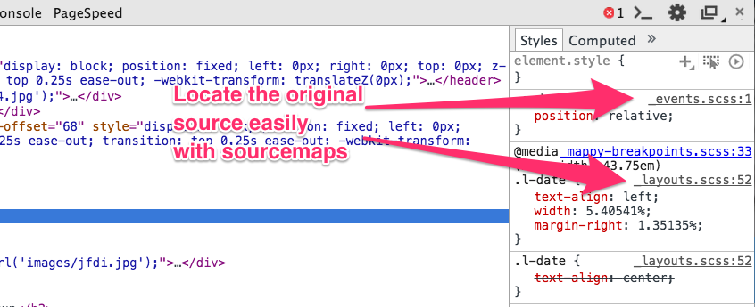 A sourcemap is a string of information that tells the browser where different sections of the code is stored. With a CSS sourcemap, you can easily locate the original source code of specific lines of CSS just by checking out the inspector.