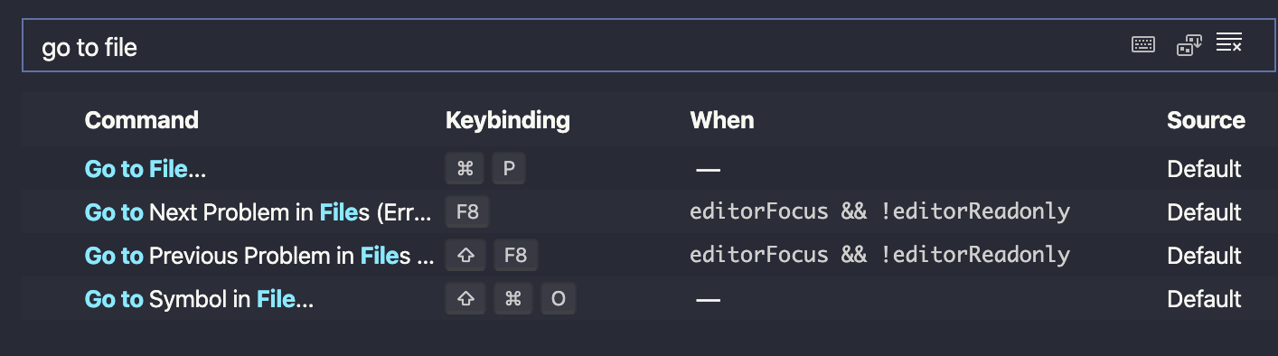 Next, I brought back Command + P as a keyboard shortcut. To do this, open up keybindings.json by clicking on the third icon from the top-right corner.