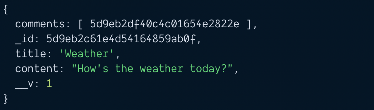 // Searches for commentsconst blogPost = await BlogPost.findOne({ title: 'Weather' })const comments = await Comment.find({ _id: blogPost._id })console.log(comments)
