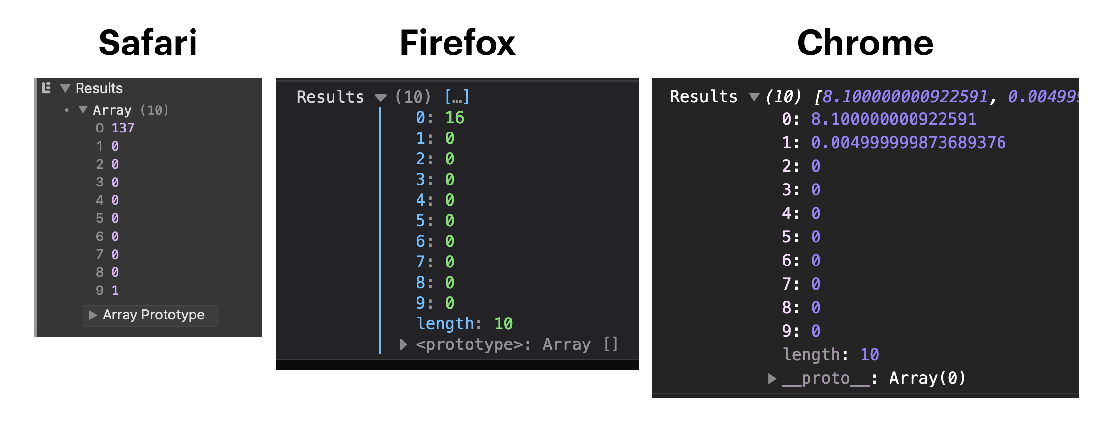 Second, performance.now gets rounded off to the nearest millisecond in Safari and Firefox. So there’s no point comparing anything that takes less than 1ms.