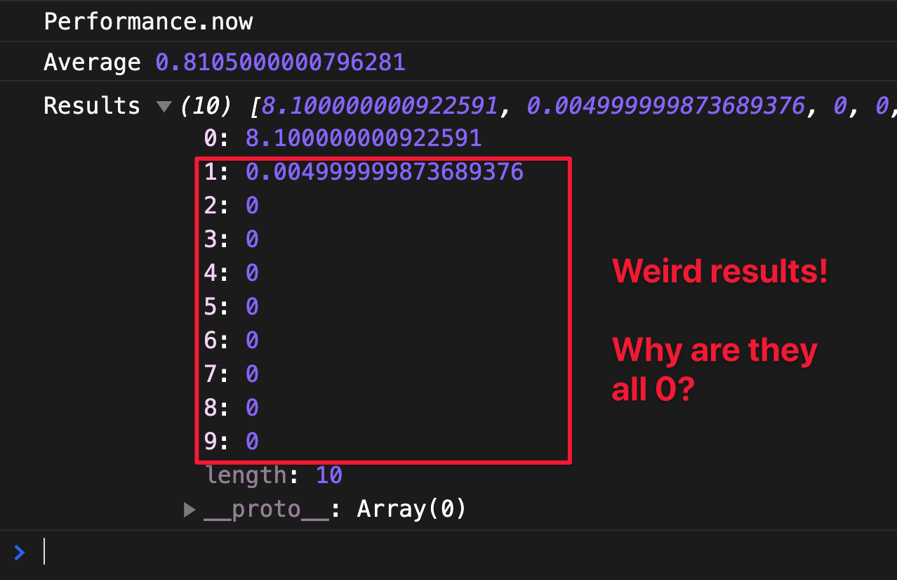 const average = results.reduce((sum, curr) => curr + sum, 0) / results.length console.log(message) console.log('Average', average) console.log('Results', results)}But the results were strange: the elapsed timing for the second loop onwards dropped to zero. This happened for both perf and perfDate.