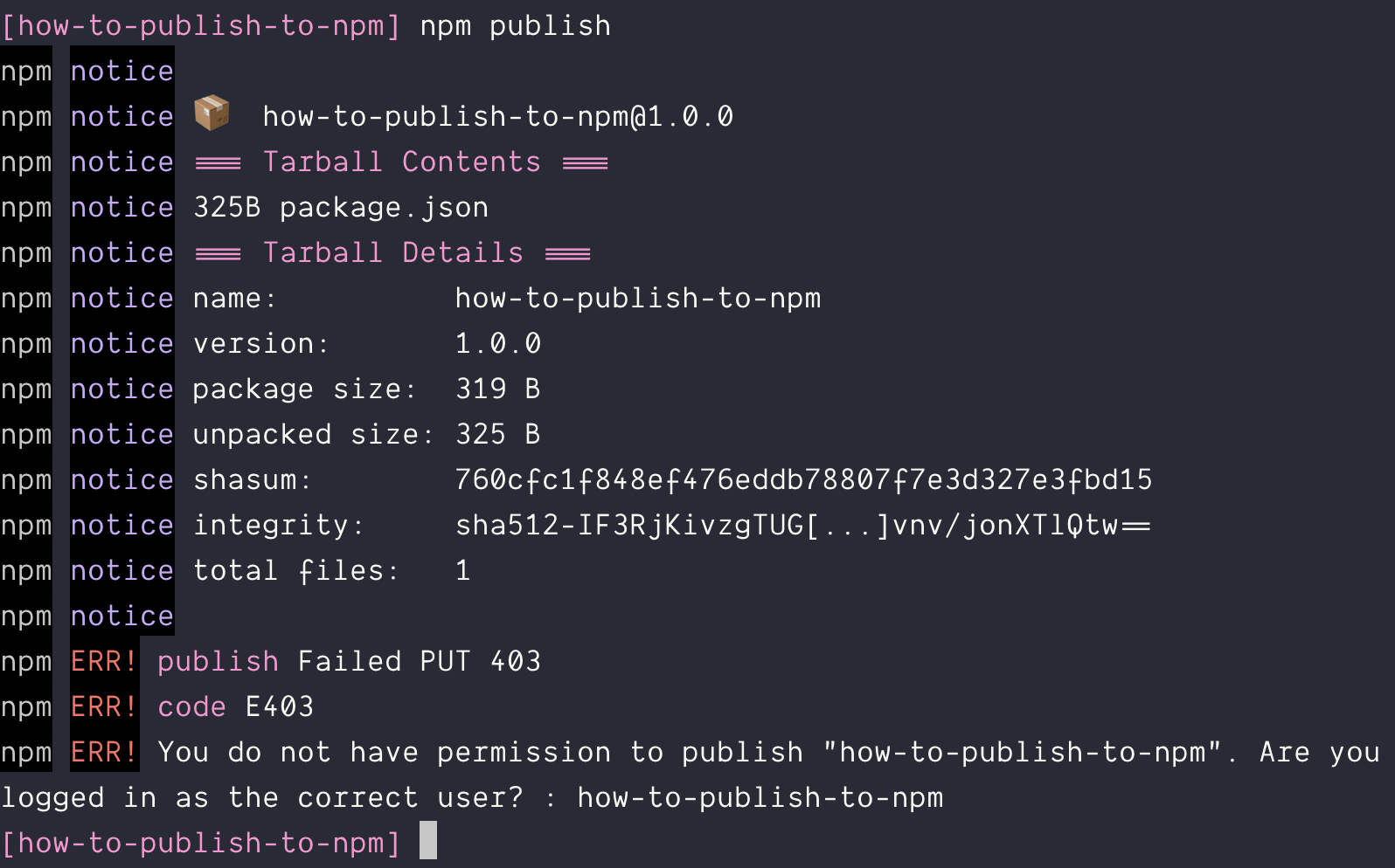 npm publishIf the package already exists on npm (because your package has the same name as another package on npm), you won’t be able to publish it. You’ll get an error.