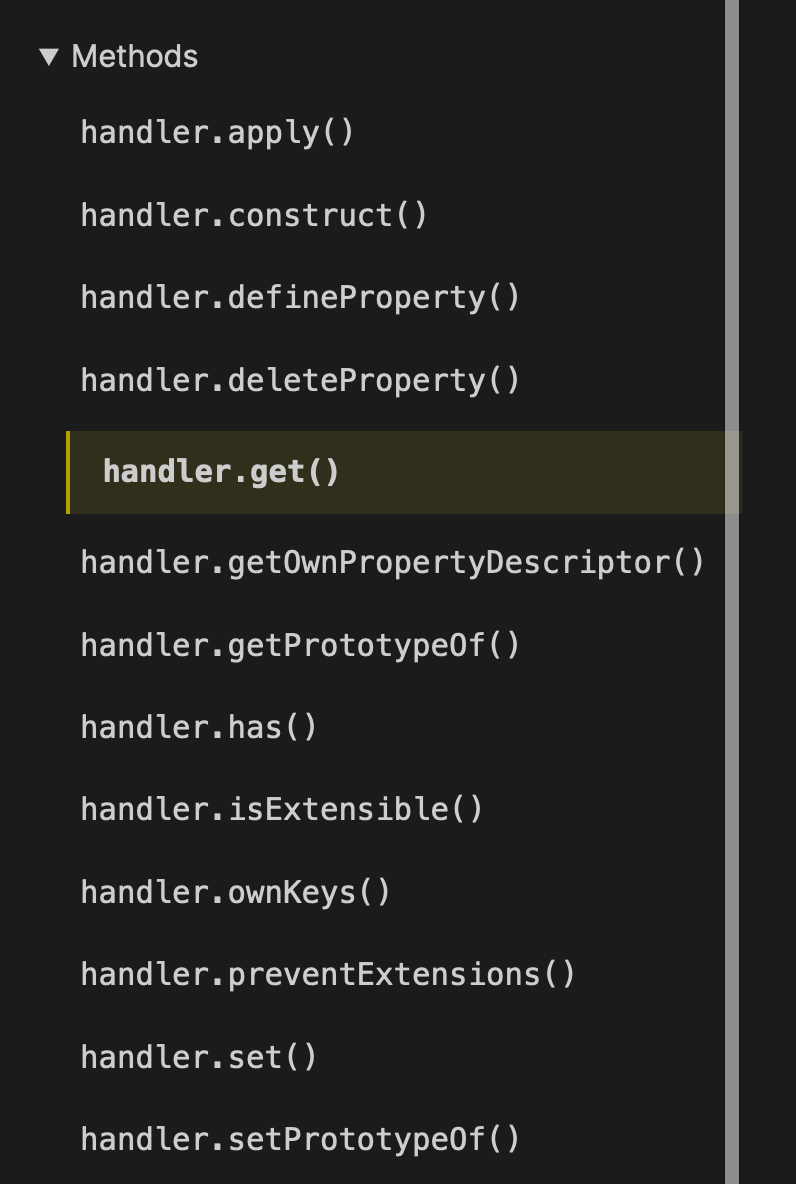 // Setting the `show` valuestate.show = trueconsole.log(state.show) // trueFun Fact: The get, set, and other methods in a Proxy are called traps. I