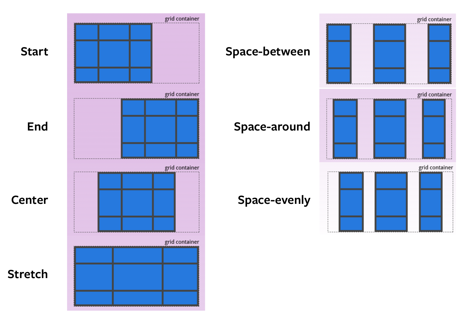 The pictures above are taken from CSS Tricks’s A complete Guide to Grid. It explains what each value does in detail. You can read it for more information.