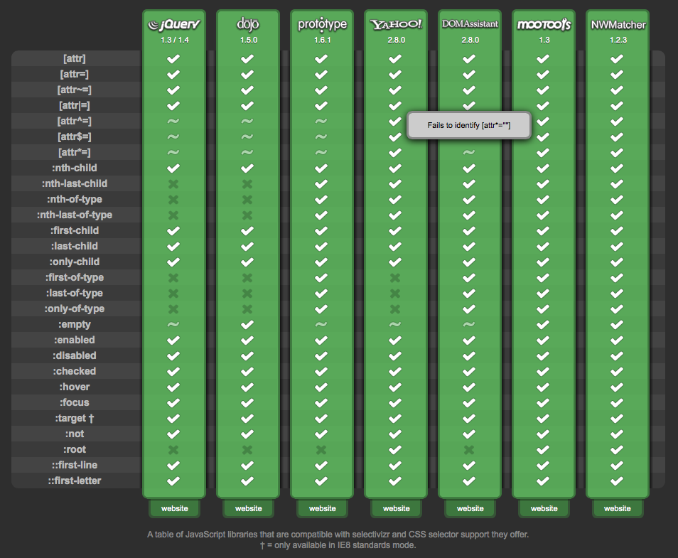 MooTools and NWMatcher are the only two JavaScript libraries allows Selectivizr to provide support for all CSS3 selectors in IE8. jQuery unfortunately, provides the least support of all.