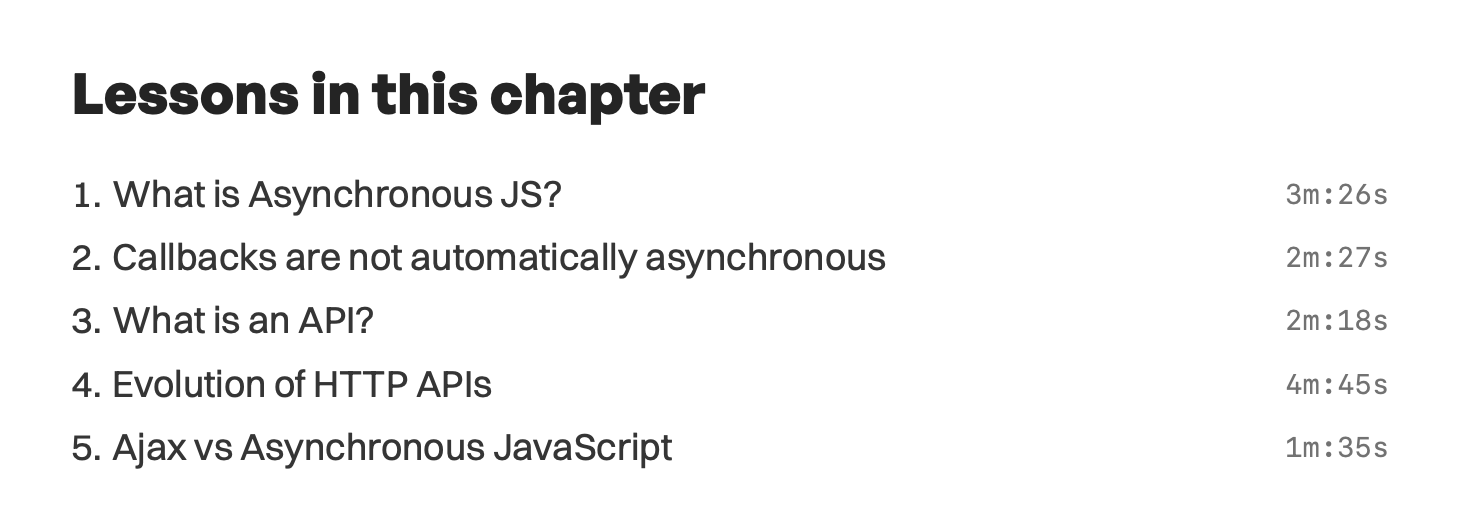 In the first chapter, you get to understand what Asynchronous JavaScript is (and what it is not). You will also learn what an API is (and what it is not).